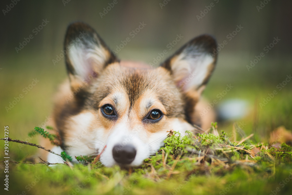 Welsh Corgi Pembroke Cute Sable Dog Autumn Color Portraits On The Moss Stock Photo Adobe Stock
